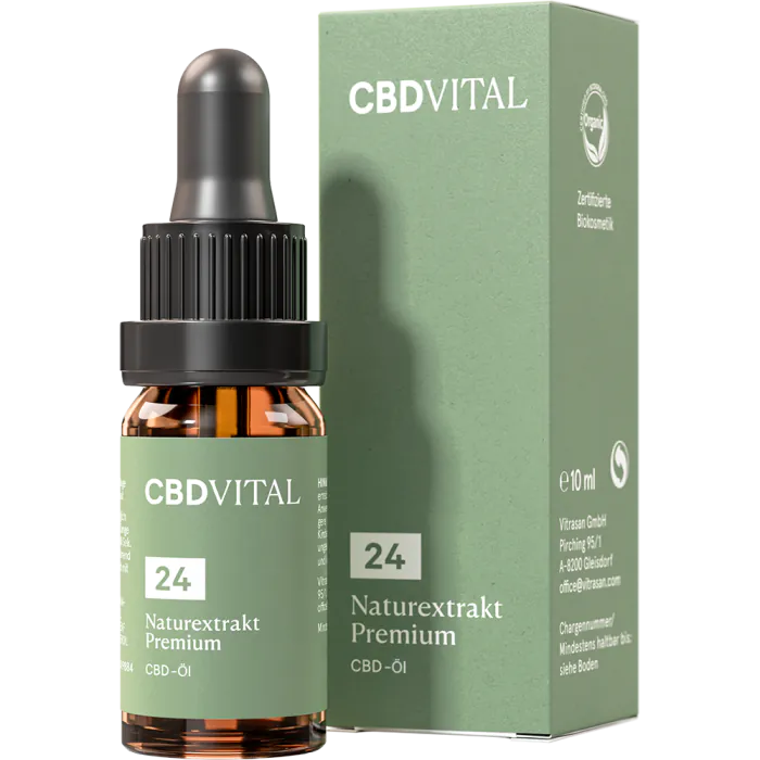 Das Naturextrakt Premium CBD Öl 24% wirkt auf der Mundschleimhaut und spendet so direkt die intensive Kraft der Hanfpflanze. Durch das synergistische Zusammenspiel zwischen CBD-reichem Hanfblätterextrakt und Bio-Hanfsamenöl sind optimale Effekte und eine maximale Verträglichkeit bei höchster Reinheit gegeben. Das CBD VITAL Naturextrakt PREMIUM 24% beinhaltet ausschließlich natürliches (organisches) Cannabidiol. Es wird kein künstliches, synthetisches CBD zugesetzt, was bei vielen CBD-Produkten der Fall ist. Vitamin E schützt Zellen vor oxidativen Stress. Besonders hochwertig, ohne unnötige Zusatz- und Konservierungsstoffe.