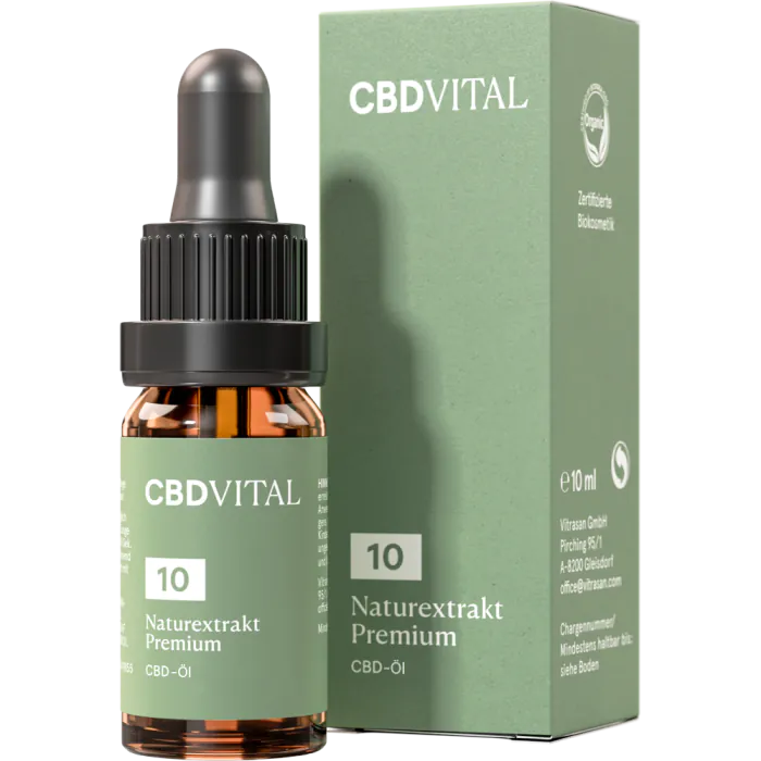 Das Naturextrakt Premium CBD Öl 10% spendet die intensive Kraft der Hanfpflanze. Durch das synergistische Zusammenspiel zwischen CBD-reichem Hanfblätterextrakt und Bio-Hanfsamenöl sind optimale Effekte und eine maximale Verträglichkeit bei höchster Reinheit gegeben. Das CBD VITAL Naturextrakt PREMIUM 10% beinhaltet ausschließlich natürliches (organisches) Cannabidiol. Es wird kein künstliches, synthetisches CBD zugesetzt, was bei vielen CBD-Produkten der Fall ist. Vitamin E schützt Zellen vor oxidativen Stress. Besonders hochwertig, ohne unnötige Zusatz- und Konservierungsstoffe.
